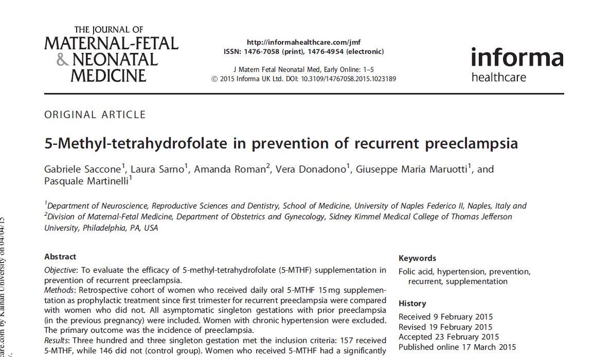 Talian z roku 2015 retrospektívna kohortová štúdia (n = 303 žien s predchádzajúcou preeklampsiou) to ukázala 15 mg 5-MTHF denne od prvého trimestra znížilo celkovú recidívu preeklampsia od 39,7 % do 21,7 % (OR 0,57, 95 % CI 0,25–0,69), závažná preeklampsia od 8,9 % do 3,2 % (OR 0,44, 95 % CI 0,12–0,97) a skorý nástup preeklampsia od 7,5 % do 1,9 % (OR 0,34, 95 % CI 0,07–0,87) [2].