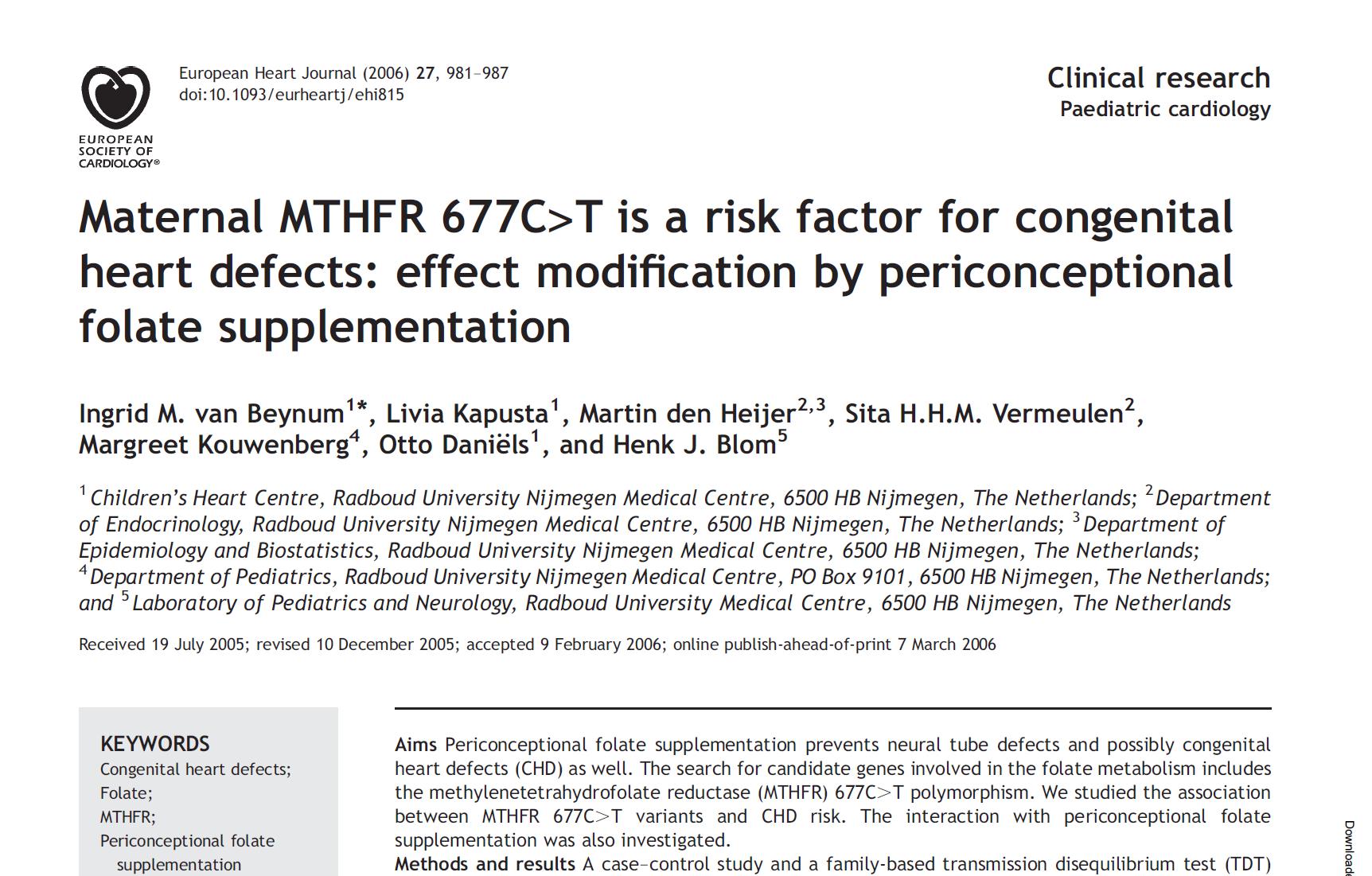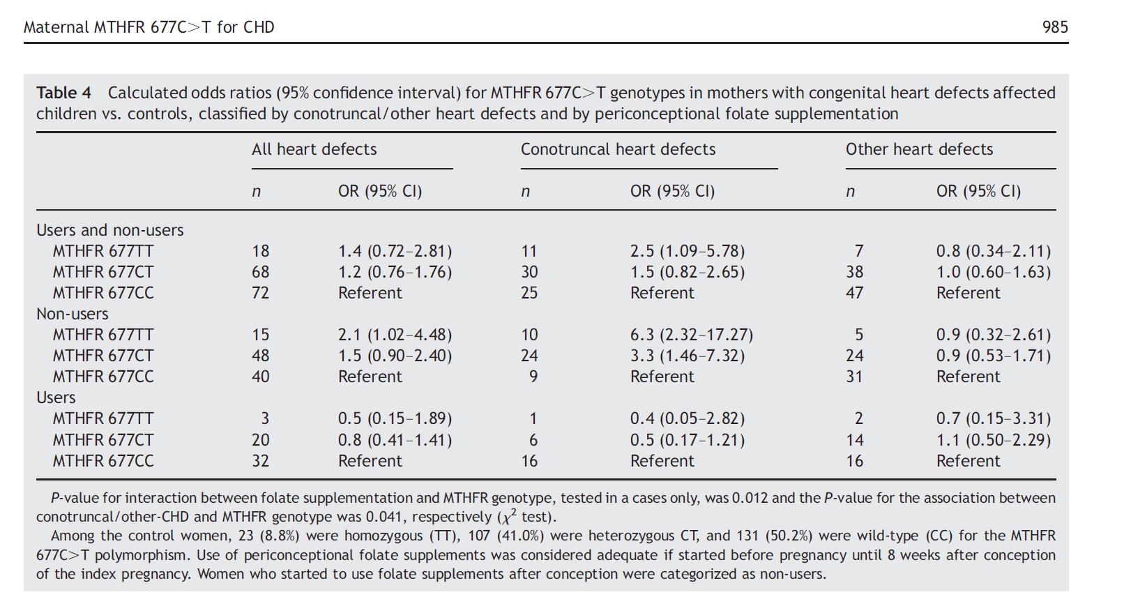 Medzi 165 rodinami s vrodenými srdcové choroby (CHD) a 220 kontrolných rodín, matiek, ktoré mali MTHFR 677 CT alebo TT genotyp a NEužívali perikoncepčné doplnky folátov oveľa pravdepodobnejšie, že bude mať dieťa so srdcovými chybami prevodového typu (OR 3,3 a 6.3).