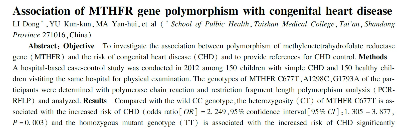 Štúdia z detskej nemocnice Qilu v Shandongu Univerzita ukázala, že alela T MTHFR C677T zvyšuje pravdepodobnosť CHD 1,8-násobne; Genotypy TT a CT zvyšujú riziko na 3,1-násobok a 2,2-násobok.