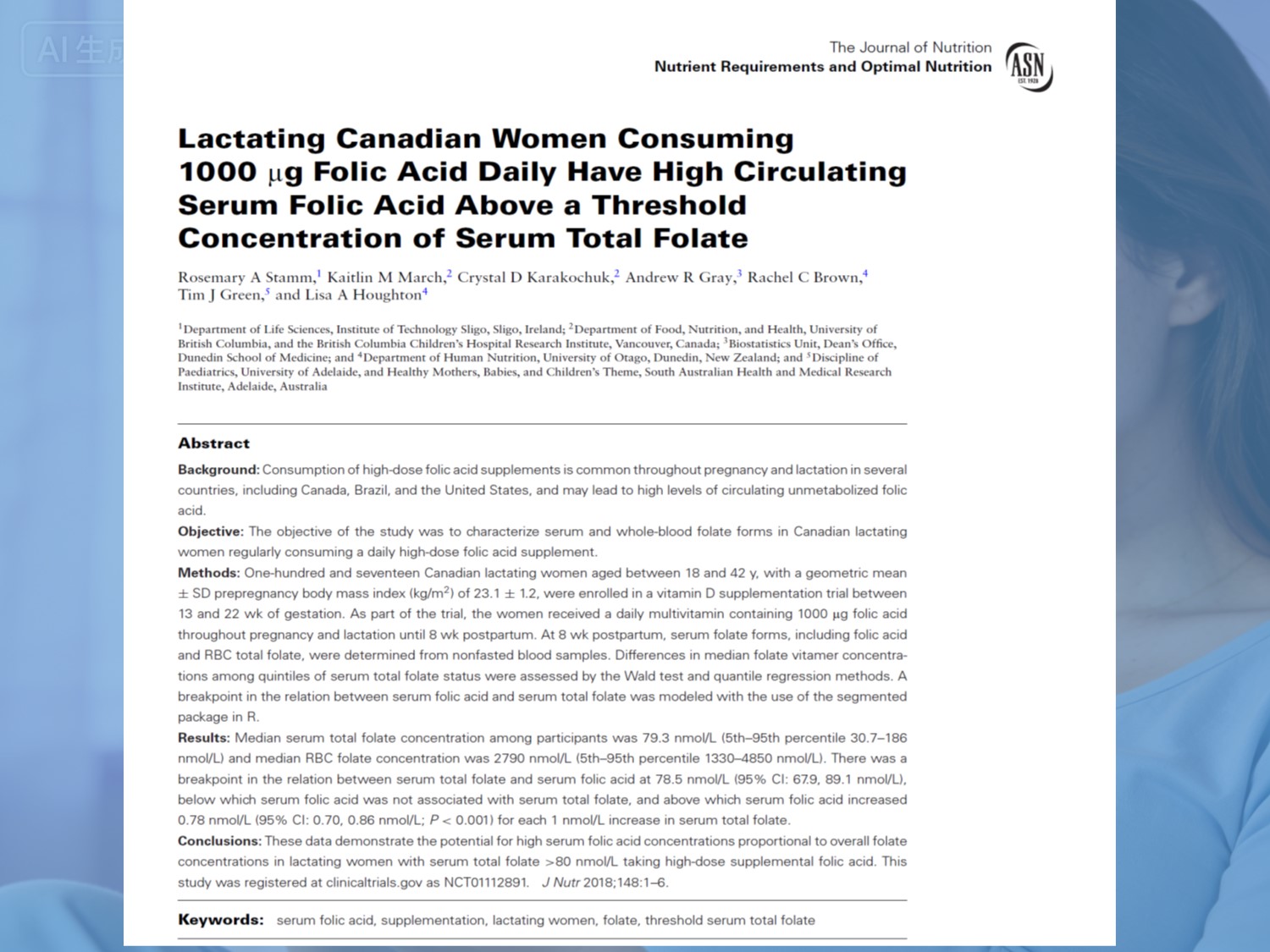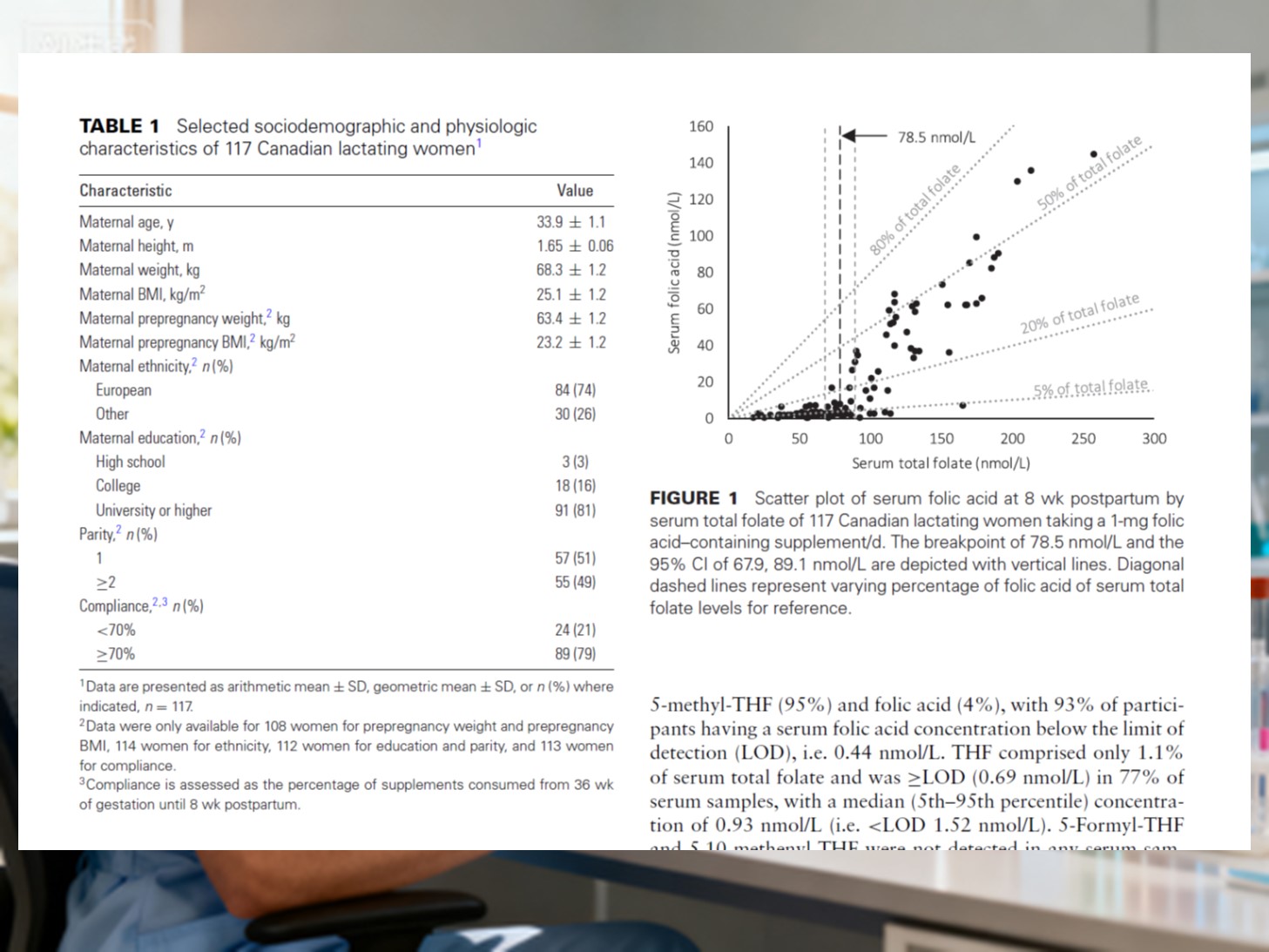 Do štúdie bolo zaradených 117 zdravých dojčiacich žien. Od polovice tehotenstva ďalej, zobrali 1000 μg kyseliny listovej plus 12 μg vitamínu B₁₂denne, pokračuje až do 8 týždňov po pôrode. Vzorky krvi odobraté 8 týždňov po pôrode sa analyzovali na folátové formy.