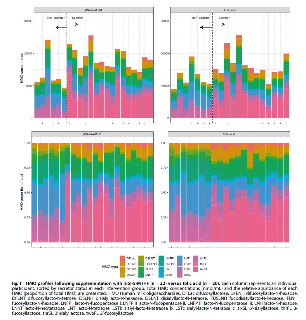 Z tejto štúdie vyplynulo neočakávané zistenie: aj keď celkové hladiny HMO sa medzi týmito dvoma skupinami významne nelíšili, podiel nemetabolizovanej kyseliny listovej (UMFA) v materskom mlieku skupina kyseliny listovej dosiahla až 29 %, čo je viac ako desaťnásobok v porovnaní s 5‑MTHF skupina. Predovšetkým analýza údajov odhalila, že boli vyššie hladiny UMFA spojené s nižšími celkovými koncentráciami HMO a výrazne znížené 3′SL.